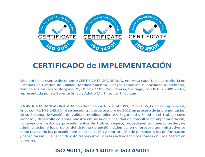 En LOGISTICA MIRANDA nos preocupamos por las personas y la mejora continua de nuestros procesos y medio ambientales, el cual se toma con mucha responsabilidad generando confianza y seguridad en nuestras operaciones A través de CERTIFICATE implementamos la auditoria para poder cumplir los estándares mas altos en nuestros procesos logísticos para el PROYECTO ISO 9001, ISO 14001 e 45001